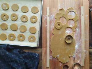 Stendere il resto dell’impasto ad uno spessore di 3 mm e ricavare dei dischi da 4 cm di diametro, a metà dei biscotti ricavati praticare un voro centrale con un taglia biscotti più piccolo, sistemarli su di una placca con carta forno e cuocerli in forno ventilato a 180° per 10/12 minuti, una volta pronti lasciarli raffreddare.