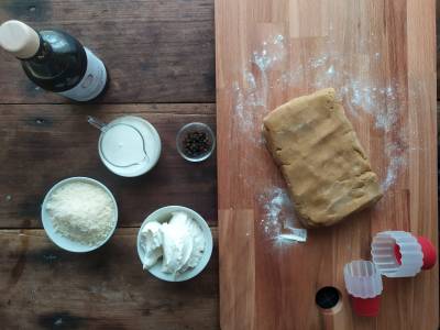 Trasferire l’impasto sul tagliere leggermente infarinato, formare un panetto, avvolgerlo in pellicola e farlo rassodare in frigorifero per almeno 1 ora.