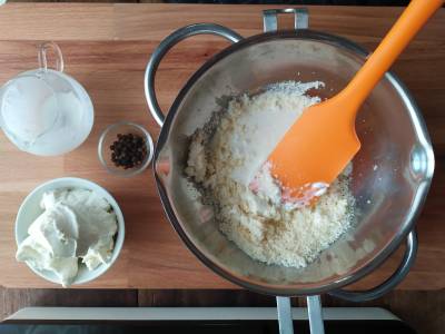 Una volta raffreddata unire alla crema di parmigiano il formaggio cremoso ed amalgamare il tutto quindi trasferire il composto in una sacca da pasticcere con bocchetta zigrinata.