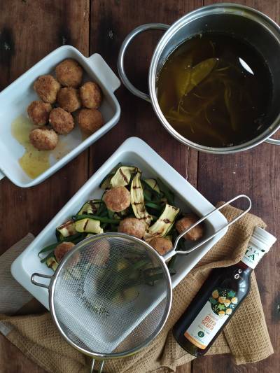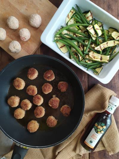 Versare un filo di olio in una padella e cuocere le polpette a fiamma dolce rosolandole da ambo i lati, una volta pronte disporle nella pirofila insieme alle verdure, poi coprire il tutto con il carpione filtrato e lasciare riposare il tutto per almeno 1 ora.