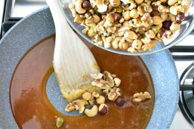 150 g di frutta secca mista (mandorle, nocciole, anacardi, noci) 15 g di semi misti (sesamo bianco e nero, zucca, girasole, lino) 130 g di zucchero semolato bianco 3 cucchiai di Aceto Balsamico invecchiato Sigillo PLATINO