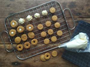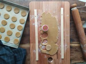 Stendere il resto dell’impasto ad uno spessore di 3 mm e ricavare dei dischi da 4 cm di diametro, a metà dei biscotti ricavati praticare un voro centrale con un taglia biscotti più piccolo, sistemarli su di una placca con carta forno e cuocerli in forno ventilato a 180° per 10/12 minuti, una volta pronti lasciarli raffreddare.