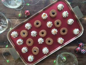 Formare degli spuntoni con la mousse al parmigiano sui frollini più piccoli e decorarli a piacere con pezzetti di frutta secca o candita.