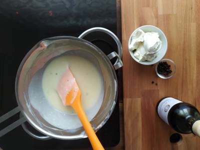 Nel frattempo preparare la mousse, riunire in un ciotola di acciaio, il Parmigiano Reggiano, una macinata di pepe e versare poco a poco la panna mescolando con una spatola, poi trasferire la ciotola su un bagnomaria e continuare la cottura per 3/4 minuti o fino a quando il composto non risulta liscio e omogeneo, quindi riporre la crema in frigorifero per alcune ore, mescolandola di tanto in tanto.