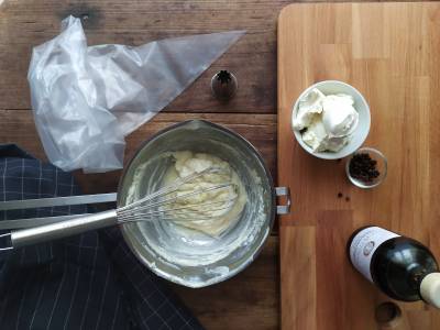 Una volta raffreddata unire alla crema di parmigiano il formaggio cremoso ed amalgamare il tutto quindi trasferire il composto in una sacca da pasticcere con bocchetta zigrinata.