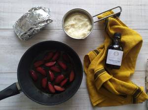 Nel frattempo, eliminare parte del grasso dalla padella, unire ancora un poco di Aceto Balsamico Invecchiato Sigillo Platino e il fondo di cottura della pirofila, aggiungere le prugne tagliate a spicchi e cuocerle per alcuni minuti a fiamma vivace.