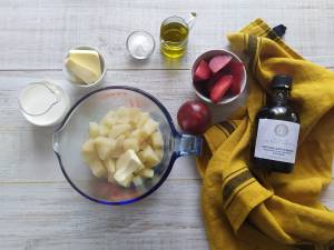 Per il purè: lessare il sedano rapa in abbondante acqua a bollore salata, una volta morbido scolarlo e frullarlo con un mixer ad immersione aggiungendo il burro e a filo il latte caldo, fino ad ottenere una consistenza cremosa.