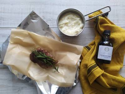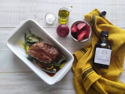 Trasferire il petto in una pirofila con un filo di olio, le restanti erbe aromatiche e un paio di cucchiai di Aceto Balsamico Invecchiato Sigillo Platino e completare la cottura in forno, già caldo, per 6 minuti a 180°. Una volta terminata, sfornare e lasciare riposare la carne avvolta prima nella carta forno e poi nell’alluminio per almeno 10 minuti.